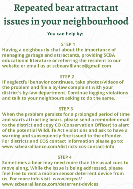 Here on the Sunshine Coast we live in bear country with bears passing through the area as they forage for food. In BC it is an offence to feed or leave out items that will attract wildlife. You can be fined under the Wildlife Protection Act.